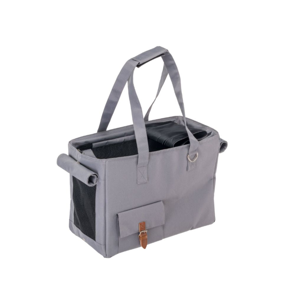 Dotata di una robusta struttura, la borsa Jetset è caratterizzata da un design elegante e moderno, con comode tasche frontali chiuse da fibbie sicure per riporre accessori e oggetti personali. Le aperture in rete sui lati e sulla parte superiore garantiscono una ventilazione ottimale, consentendo al vostro animale di tenere la testa fuori durante il tragitto. La rete posta ai lati è avvolgibile e bloccabile tramite un comodo bottone applicato.