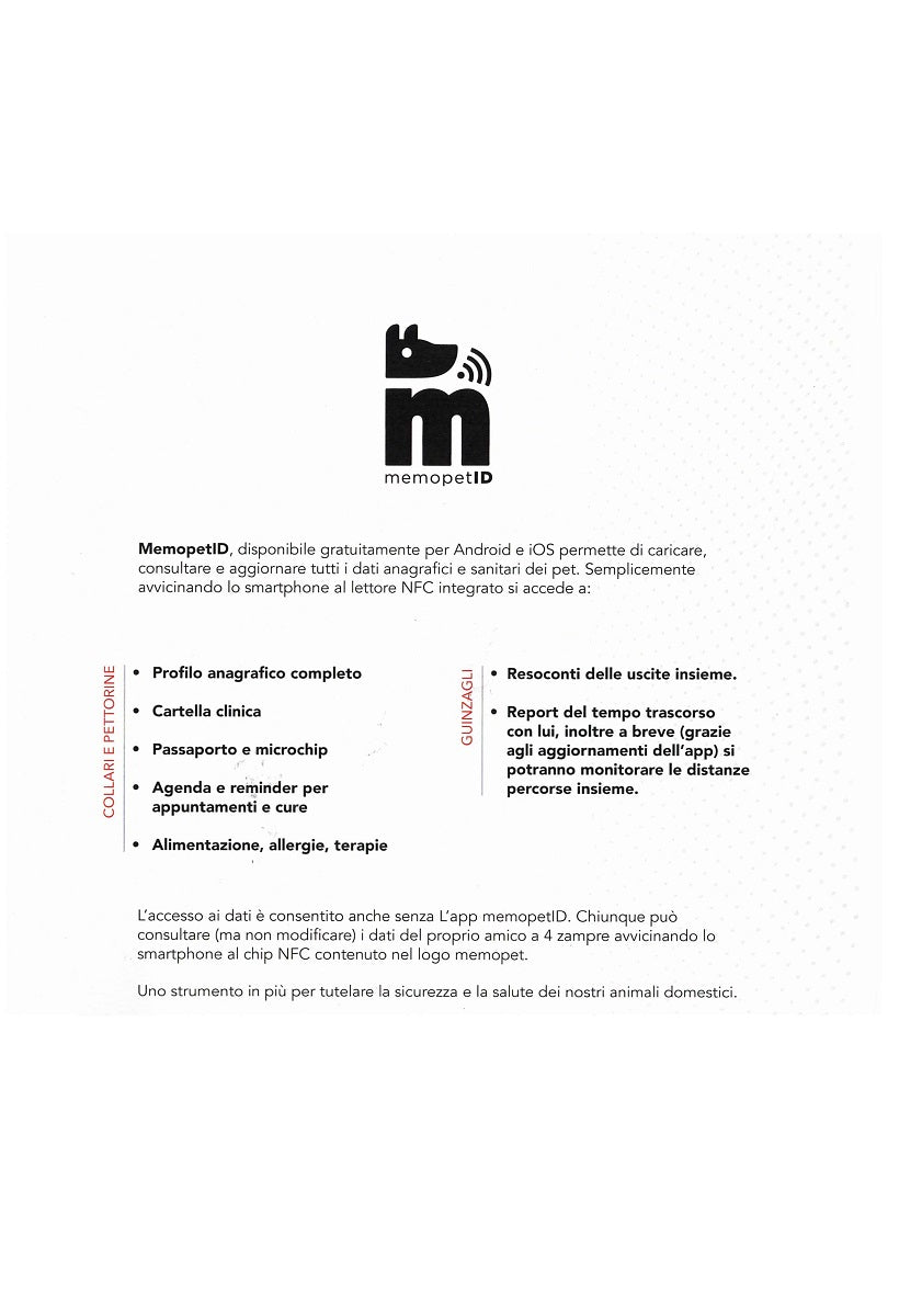 Il collare memopet è un perfetto connubio di comfort e stile. Leggero e morbidissimo, è realizzato con un doppio strato di poliestere che lo rende comodo all’ennesima potenza. Sarà il vostro compagno ideale per le avventure di tutti i giorni, grazie anche alle sue speciali funzionalità: chip NFC per connettersi in un tap all’app dedicata e porta-tag per agganciare la medaglietta. Indossabile in tutte le condizioni meteo, non avrete più scuse per restare a casa! La linea memopet include modelli di accessori MyFamily già iconici, che conquistano senza tregua pet lovers dalle personalità più variegate grazie alla loro versatilità e alla vasta gamma di colori disponibili. Dedicati a chi ha il culto della comodità, ovunque vada.