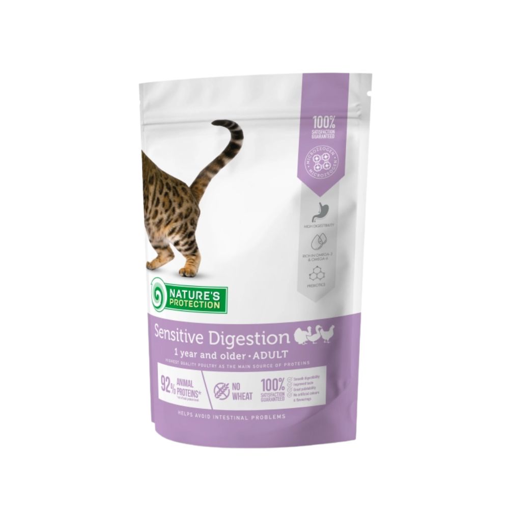 Nature's Protection Sensitive Digestion per gatti da 1 anno in su con pollame è un alimento secco completo e bilanciato Super Premium con fonti proteiche e materie prime di altissima qualità. La composizione di questo alimento secco per gatti è arricchita da ingredienti perfetti per fornire la quantità di calorie, vitamine e minerali necessaria ai gatti con digestione sensibile.
